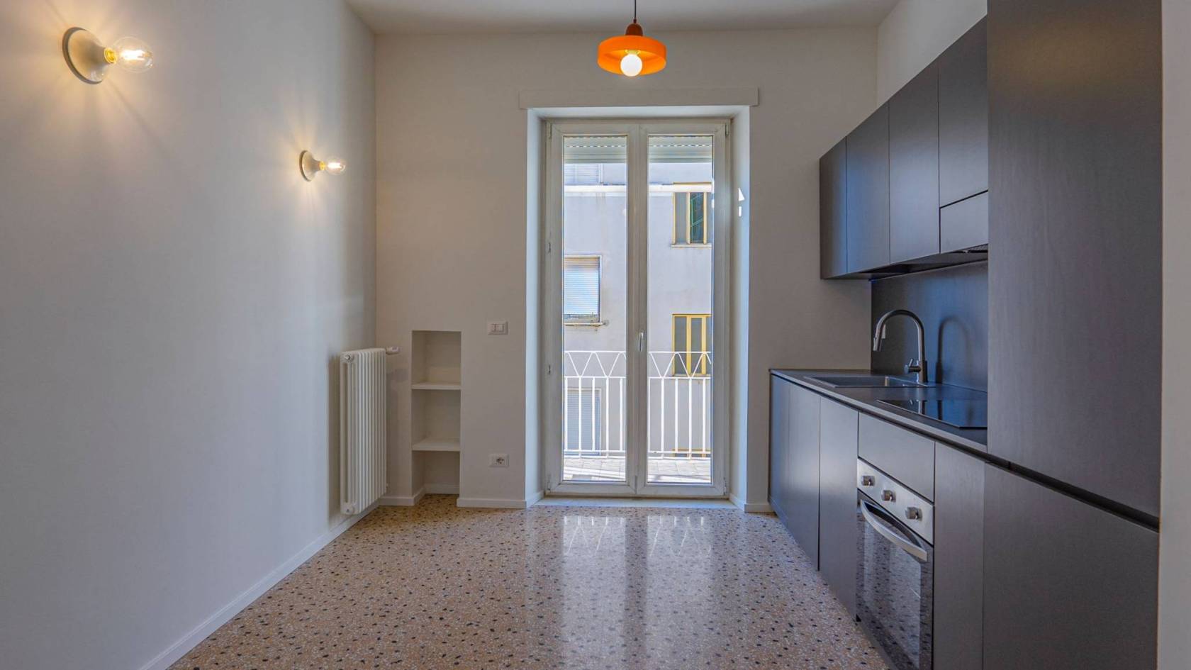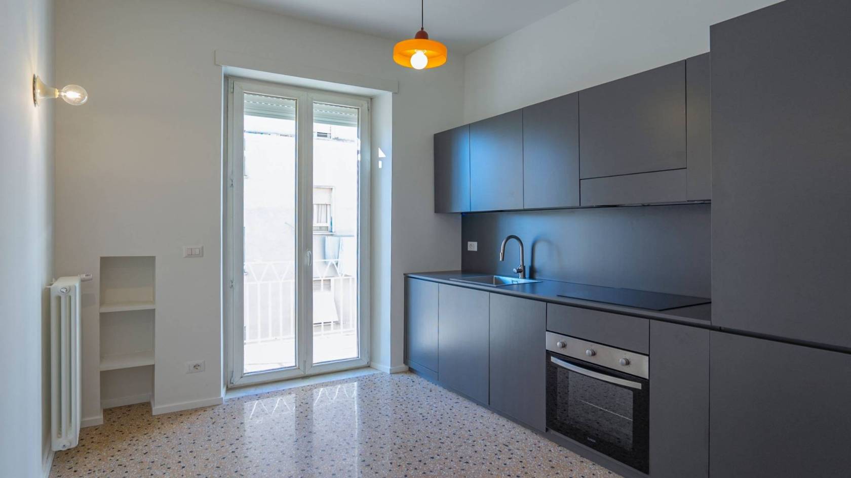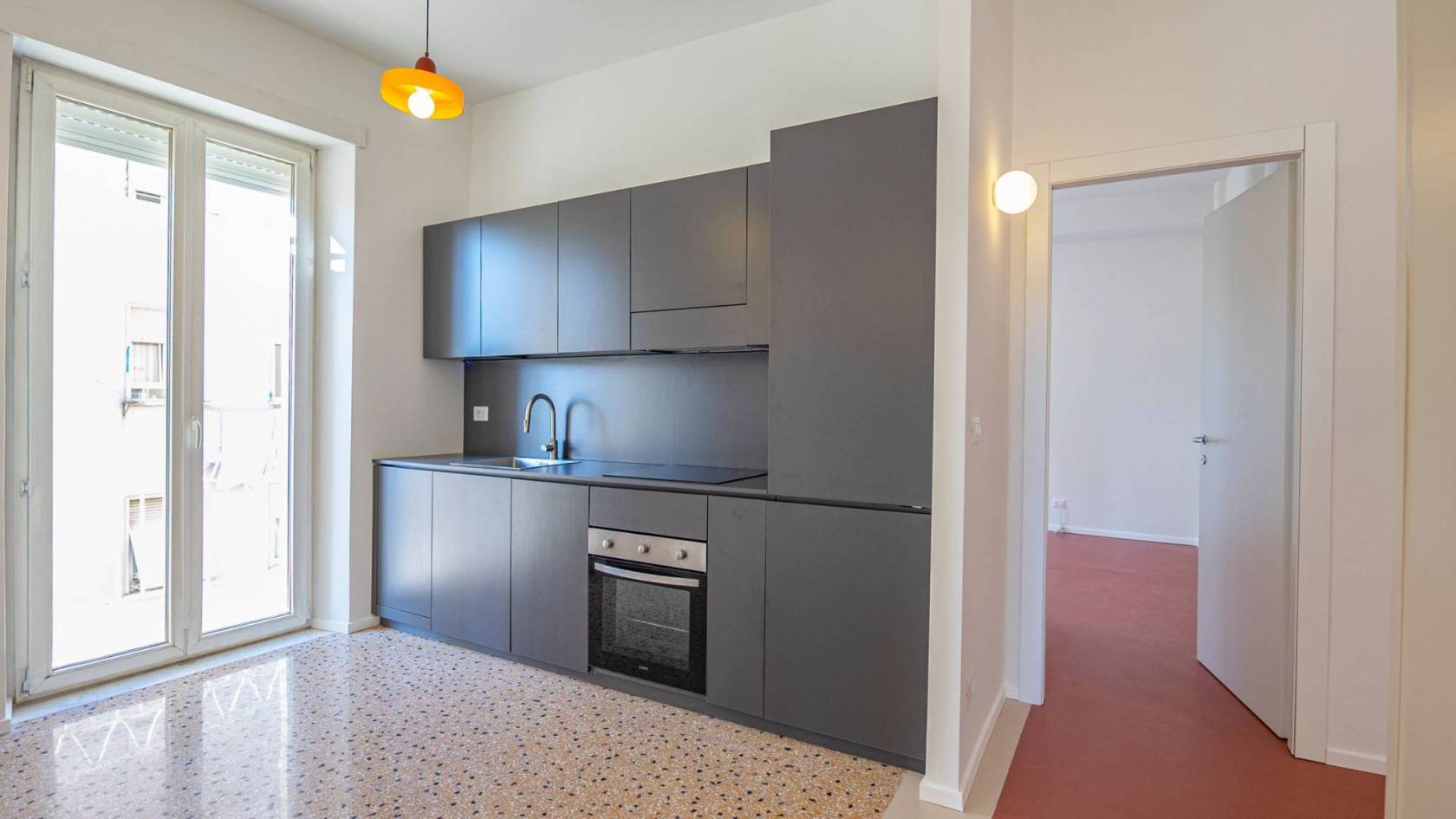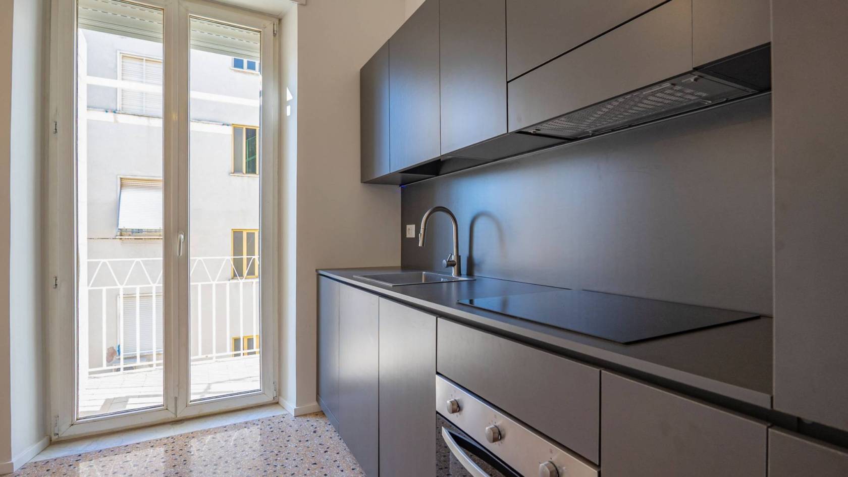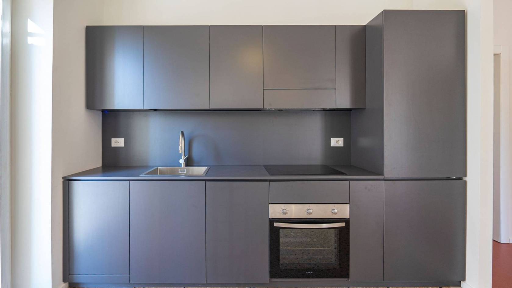 • una cucina a vista sul soggiorno con porta finestra sul primo balcone, arredata nei colori del grigio e completa di frigorifero a colonna, lavastoviglie, forno elettrico e piano cottura a induzione. Tutti gli elettrodomestici sono in garanzia.